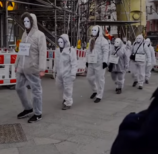 حيث يظهر في الفيديو عشرات الأشخاص في برلين مرتدين لباس كورونا الطبي الواقي ، و واضعين أقنعة تغطي ملامح وجوهمم .