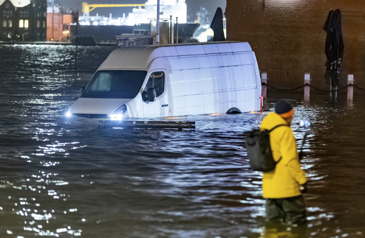 و غمرت المياه سوق السمك في مدينة هامبورغ بالكامل، بعد اندفاع مياه نهر إلبه إليه و باتجاه الشوارع المحيطة نتيجة العاصفة الشديدة.