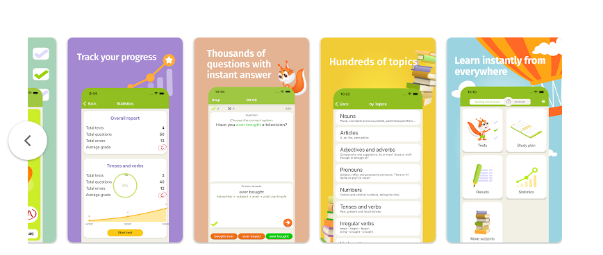 ويحتوي على آلاف الأسئلة التي تختبر فهمك للقواعد، مع شرح واضح وفوري لكل إجابة خاطئة.