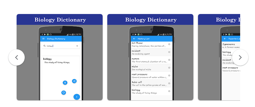 تطبيق Biology Dictionary من التطبيقات التي تمنحك شعورًا حقيقيًا بأن دراسة الأحياء باتت أسهل، فعند فتح التطبيق، تجد أمامك عددًا هائلًا من المصطلحات العلمية، أي أكثر من 100 ألف مصطلح ، مما يعني أن كل ما تحتاجه تقريبًا ستجده فيه.