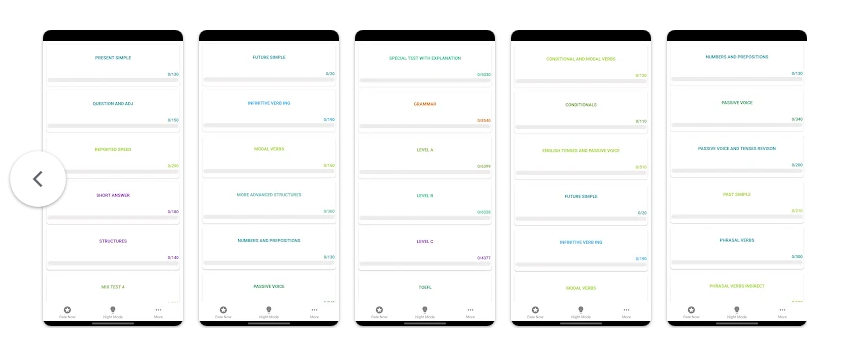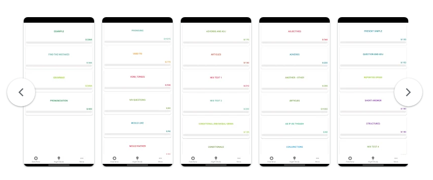 يوفر التطبيق للمبتدئين، أكثر من 1,500 تمرين، وللمستوى المتوسط والمتقدم أقسام متخصصة تغطي الأفعال، الجمل، والتراكيب النحوية الأساسية والمتقدمة.