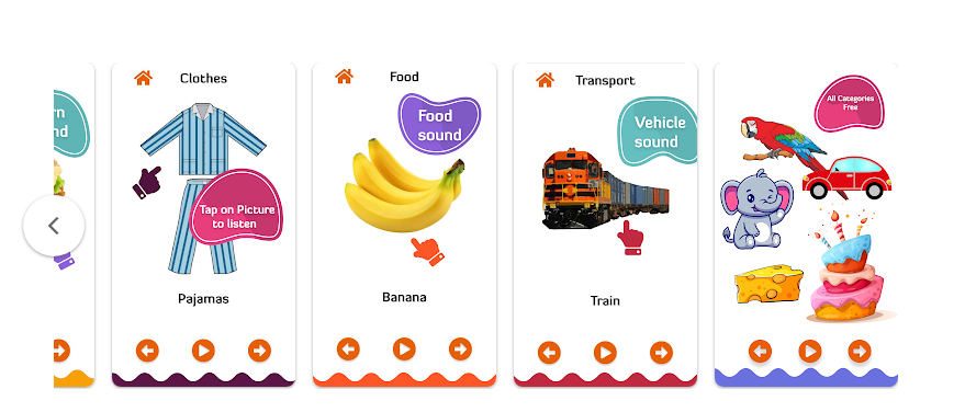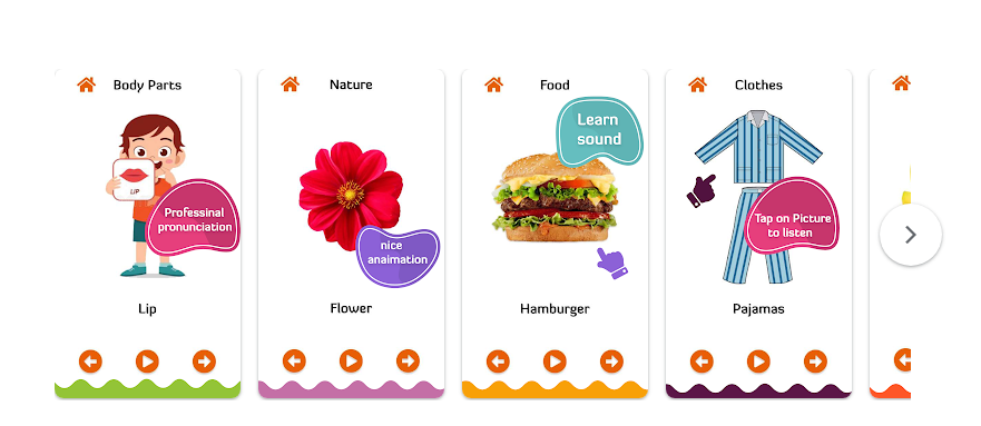 يمكّن التطبيق من النطق الصحيح، فكل كلمة تأتي بصوت واضح وصورة عالية الجودة، مما يساعد الطفل على التعرف على الأشياء وممارستها بشكل صحيح عند النطق.
