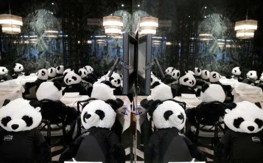 حيث تجلس دميات الباندا المحشوة على طاولات المطعم و في البار ، وبعضها يحمل زجاجات من بيرة كورونا.